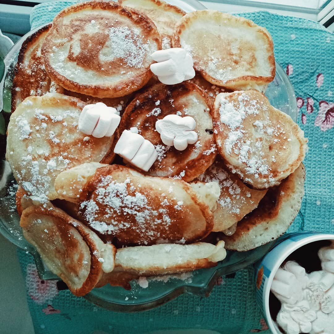 Готовые оладушки, я ещё присыпала сахарной пудрой и приукрасила маршмеллоу💗🍥