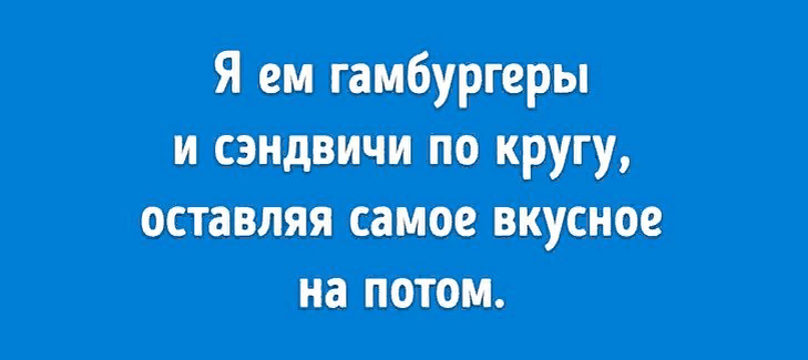 - 9.Никак не отучусь облизывать тарелки. Дома еще ничего, а как дело доходит до кафе, еле сдерживаюсь, а иногда заменяю язык куском хлеба и собираю им остатки еды с тарелки. Выгляжу, наверное, жутко голодной, но бороться с этим тяжело.