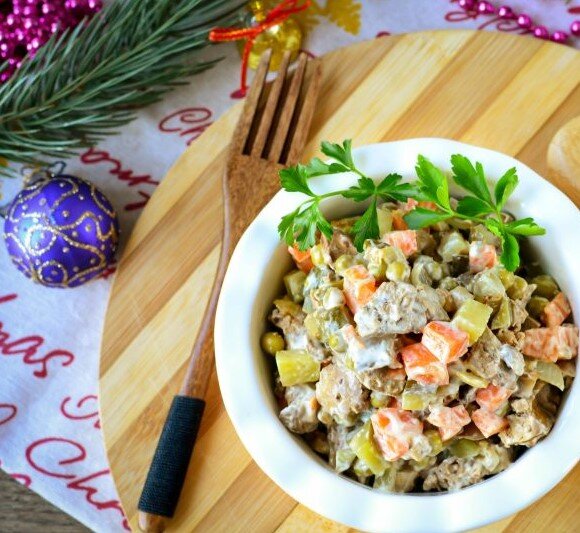 Салат «Новогодний хит» с печенью и грибами, станет настоящим гостем вашего новогоднего стола и займет достойное место среди «Оливье» и «Селедки под шубой».
