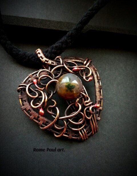 Кулон-амулет в форме сердца помогает человеку в трудные времена и защищает его. Он приносит хорошее здоровье, способствует стабилизации внутреннего мира, повышает самооценку. Еще на заре нашей цивилизации сердце, символ жизни, ума, чувств и страсти, превратилось в могущественный амулет. Наши предки, как и мы сегодня, защищались с его помощью от проблем со здоровьем и неприятностей, притягивали любовь и счастье... Кулон-подвеска JANTUNG SAMUDRA (Сердце океана (Индонезийский) с природной индийской океанической яшмой выполнен из патинированной меди в технике плетения wirewrapp. Индивидуальный уникальный рисунок внутри яшмы удивляет и поражает воображение. Словно волшебные глубоководные водоросли и кораллы застыли внутри камня много миллионов лет назад. Размер изделия: 55 мм х 45 мм Материал: патинированная медь, натуральная океаническая яшма (12мм, Индия) Без шнурка (на фото пример) Такой кулон отлично подойдёт к любому гардеробу - как к офисной блузке, разбавив её классический стиль, т