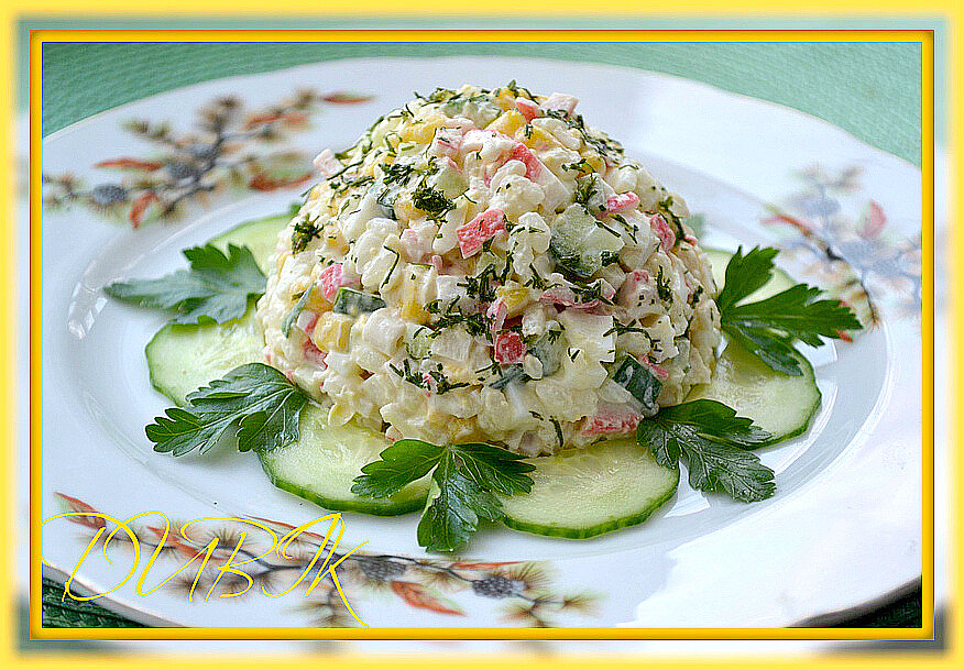 Салат из крабовых палочек с кукурузой - известный и даже немного надоевший всем салат, рецепт которого давно распространен среди домохозяек. Рис придает салату сытность, а крабовые палочки и консервированная кукуруза - оригинальный вкус. Так что давайте приготовим до боли знакомый салатик!