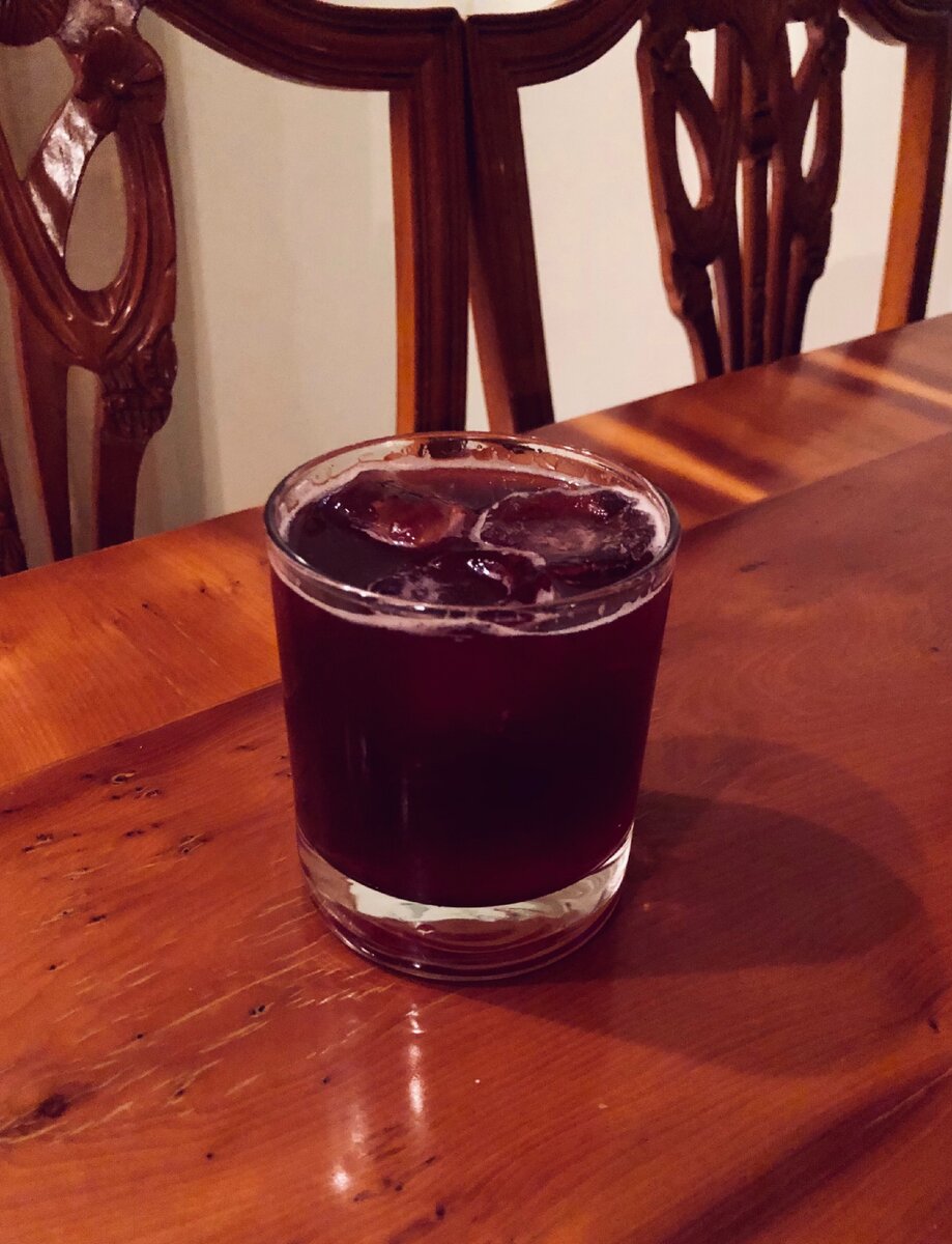 Темно-багровый напиток, где сладкая выдержанная вишня сливается с терпкой горечью и копчеными нотами кофе и все это - с тоником на льду.