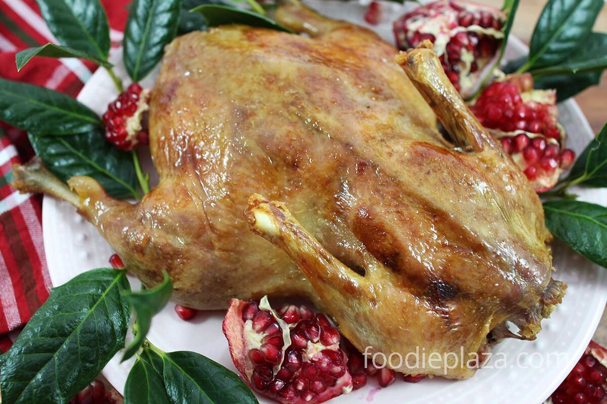 4. Достать утку из духовки, дать ей постоять минут 15 и немедленно подавать к столу, украсив по вашему усмотрению.