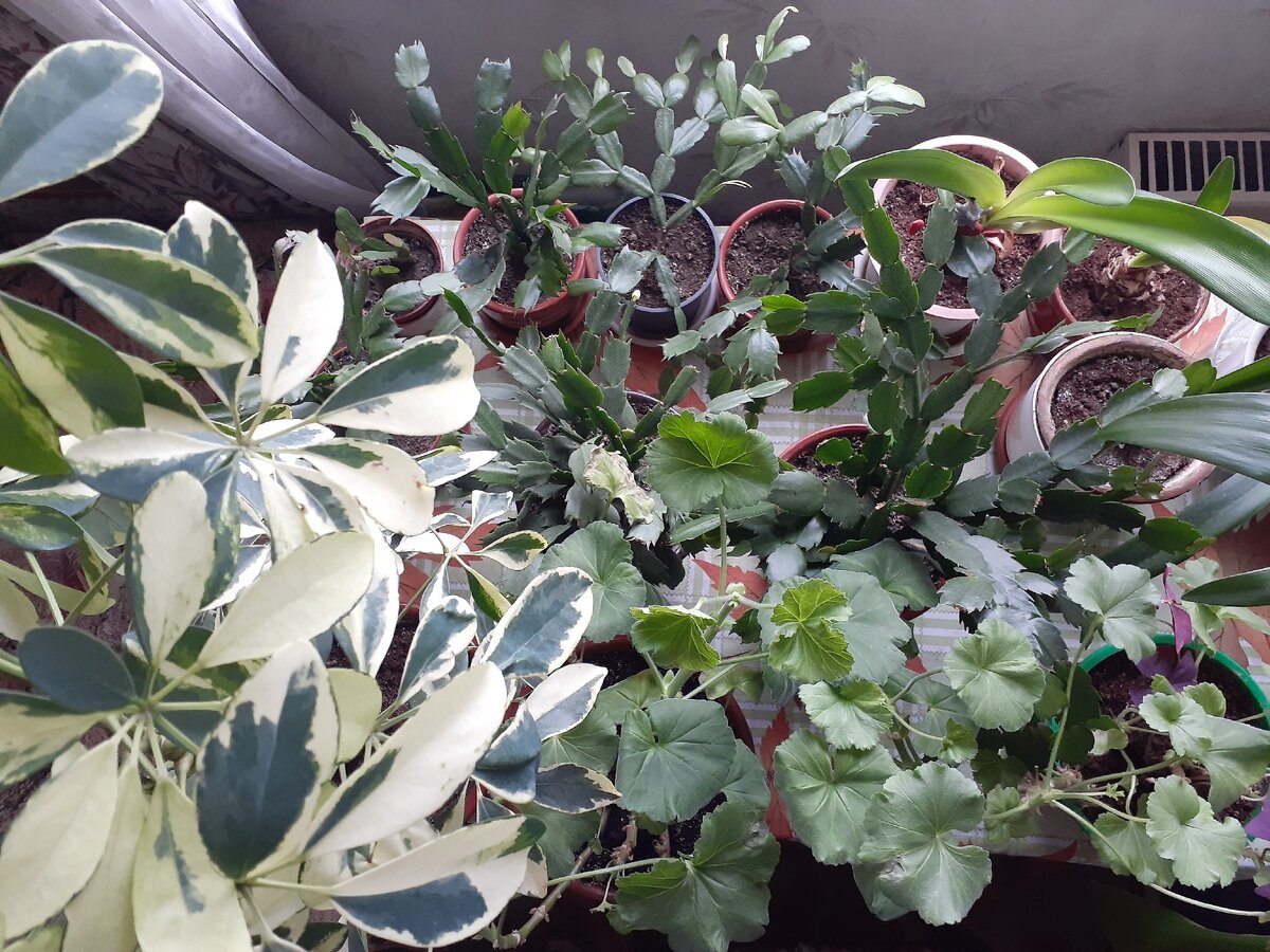 Зимой горшки с цветами ставить некуда. Как вы справляетесь с этой проблемой? Небольшие горшки расставила по подоконникам, заняла цветами целый стол перед окном. Вот вид сверху на этот стол, слева шеффлера. Просто заросли! Неудивительно, что я бутон не заметила.