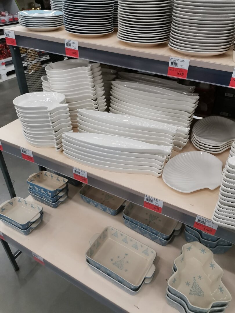 Все хозяйки, которые накрывают праздничный стол, знают, что половина успеха зависит от красивой сервировки. Для этих целей в магазине есть самая разная посуда, начиная от блюд в виде елочки и заканчивая "рыбными" тарелками. А знаете, какая цена у такой посуды? До 200 рублей. Что поменьше стоит 129 рублей, что больше - 179, но это все равно очень выгодно.