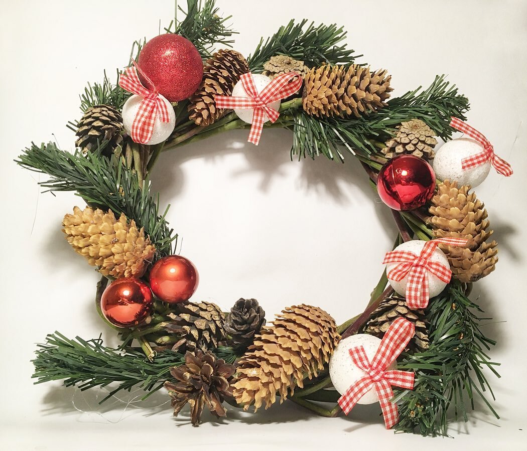 Игрушки, шишки из парка, ветки от искусственной ели, ну и клеевой пистолет (куда же без него родимого).