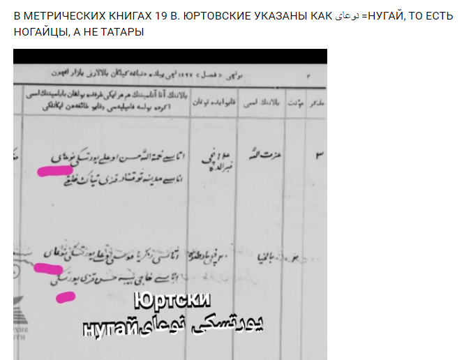 Зачастую в различных источниках встречается обозначение юртовцев как татар, что вызывает путаницу и инсинуации некоторых недобросовестных исследователей из заинтересованных кругов родственных народов. Однако, само слово «татары» или «татарин» исходно не имело прямого этнического значения (А.В.Сызранов). Так, например, в архивных документах Астрахани встречаются обозначения «тогмуцкие татары»- в отношении казахов, «трухменские татары»- в отношении туркмен, «шеретские татары»- в отношении калмыков. А еще шире в Российской империи применялся термин «адербейджанские татары»- в отношении азербайджанцев, «горские татары»- в отношении карачаевцев (См. Словарь Брокгауза и Эфрона). Эта же традиция русской администрации повлияла на обозначение ногайцев-юртовцев как «юртовских татар». Однако для самоназвания и самопрезентации ими использовалось слово нугай- рус.ногаец. Об этом свидетельствуют многие научно установленные факты. Побывавший в 19 в. в среде юртовцев ученый-этнограф П.И. Небольсин писал о них: «Сами себя они называют ногаями и считаются потомками золотоордынских ногаев, первых основателей Астрахани"(Небольсин 1852 с.52). Важную информацию содержат и материалы официальных метрических книг конца 19-нач.20 в., в которых жители юртовских сел указывали себя как нугай- ногайцы (Ишмухамбетов, Махсутов 2020). Так, в метриках периода 1880-1902 гг. сел Осыпной Бугор, Три Протоки Мошаик, Башмаковка, Кулаковка, Карагали в которых основным населением были юртовцы. для записи национальности использовалось этническое именование يورت نوغاى - юрт ногай, которое передавалось также как يورتسكى نوغاى - юртски нугай. (ГААО.Ф.1117.Оп.1.Д.73. ГААО. Ф.1117. Оп.1.Д. 104;ГААО. Ф.1117. Оп.1.Д. 256; ГААО. Ф.1117. Оп.1.Д. 284:ГААО Ф.1117 Оп.1. Д.324;ГААО. Ф.1117. Оп.1.Д. 457;ГААО. Ф.1117.Оп.1.Д.217; ГААО. Ф.1117. Оп.1.Д.179;ГААО. Ф.1117. Оп.1.Д.104). Сами казанские татары и мишари будущих «астраханских татар» звали именно ногаями. Так в газете издаваемой в Казани братьями Каримовыми «Кояш» № 64 от 6-го марта 1913 г. встречается исключительно этническое именование نوعاى - нугай, ногай. Распространению же «общетатарской идентичности» способтвовал т.н. «татарский проект» продвигаемый усилиями казанскотатарских интеллектуалов во главе с Ш. Марджани, который уже в советское время поддержали татарские коммунисты. Перенятию элементов татарского языка и культуры способствовали торговые контакты и браки юртовских ногаев с казанскими городскими татарами (В.М.Викторин, А.Д.Мусаев). Вместе с тем, до переписи 1926 года и несколько позднее в отношении юртовцев официально использовалось обозначение «ногайцы». Так в документе, от 1925 г. жители будущих Приволжского и Наримановского районов обозначены как ногайцы Так же как ногайцы они обозначены и в фотоматериалах В.И.Трофимова. Интересно, что и согласно данным генетики, юртовцы едины с прочими группами ногайцев (Ю.М.Юсупов 2016). Вне всякого сомнения, каждый сам волен указывать свою национальность, однако очевидно, что исторические истины и своих предков изменить и поменять невозможно. Кроме того сегодня нет более нужды жертвовать своей историей, языком и идентичностью ради чужих интересов. Никто не в состоянии отменить и необходимость сохранять память предков и восстанавливать историческую справедливость. #без_нугайлар #ногайцы #башкиры #татары #тюрки #казахи #туркмены #татаризация #