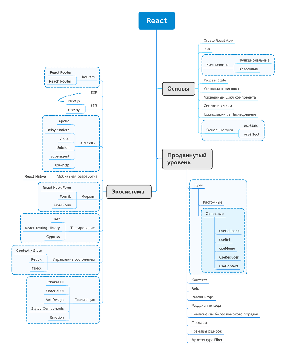 Кроме того, на продвинутом уровне вам следует подробнее почитать о контексте, рендер-пропсах, рефах и DOM. Разберитесь в React-технике HOC, которая подразумевает повторное использование логики компонента, порталах для создания DOM-узлов за пределами родительского компонента, границах ошибок и архитектуре Fiber.