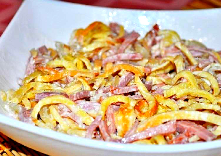 По этому рецепту вы сможете приготовить очень вкусный салат с блинами и курицей из минимума ингредиентов.