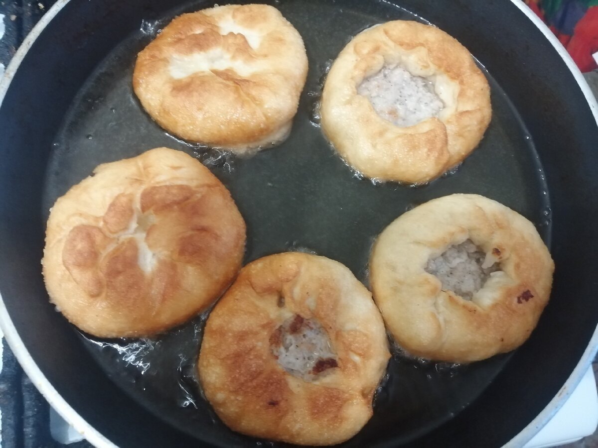5. Ставим на огонь сковороду, наливаем масло для жарки. Масла нужно столько, чтобы половина беляша была в масле. Начинаем жарить беляши сначала дырочкой или швом вниз. Жарим примерно 3-4 минуты.