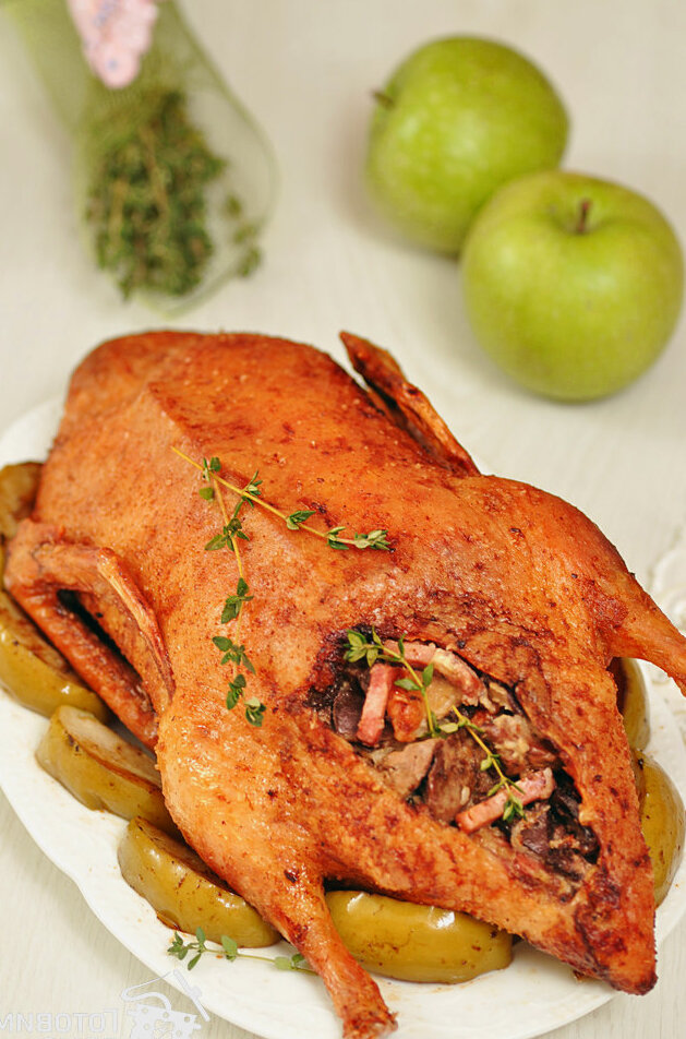 Каждый год на праздничный стол я готовлю курицу или утку по новому рецепту. В этот раз мне захотелось нафаршировать утку потрошками и добавить сочности и кислинки. Блюдо получилось отменное!