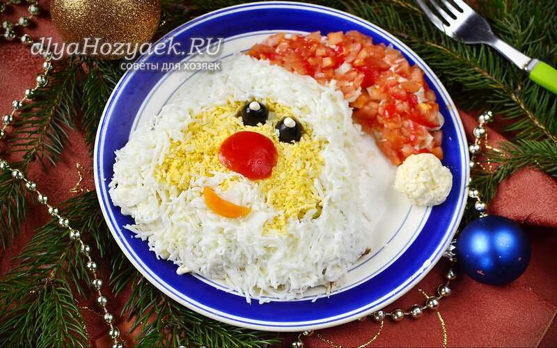 Вкусный и легкий салат «Дед Мороз» может стать главным украшением праздничного стола. Яркая шапка из помидоров, лицо из белка и желтка, глаза из маслин, а морковь – для рта, все эти тонкости подробно описаны в рецепте.