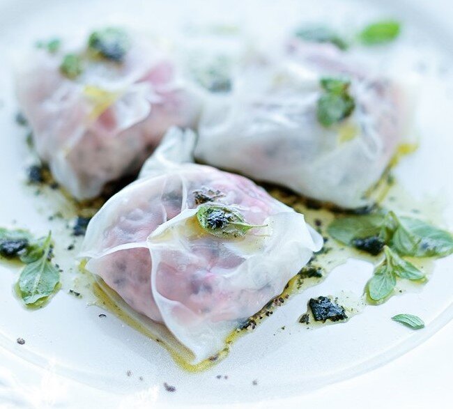 - Рисовые клецки: погрузите рисовую бумагу в очень теплую воду примерно на 10 секунд (она не обязательно должна быть горячей). Положить на столешницу, разрезать на 4 части. Оберните каждый шарик двумя листами рисовой бумаги, загибая края бумаги внутрь. Выровняйте форму для пропаривания кружком, вырезанным из бумаги для выпечки. Смазать оливковым маслом и разложить клецки. Приготовленные таким образом пельмени можно сразу же приготовить на пару, варить около 2 минут с момента закипания воды. Начинка в центре клецки должна быть горячей. Подавать с травяным маслом. Вы также можете накрыть форму для шариков алюминиевой фольгой и поставить ее в холодильник. Хранить 2-3 дня до использования.