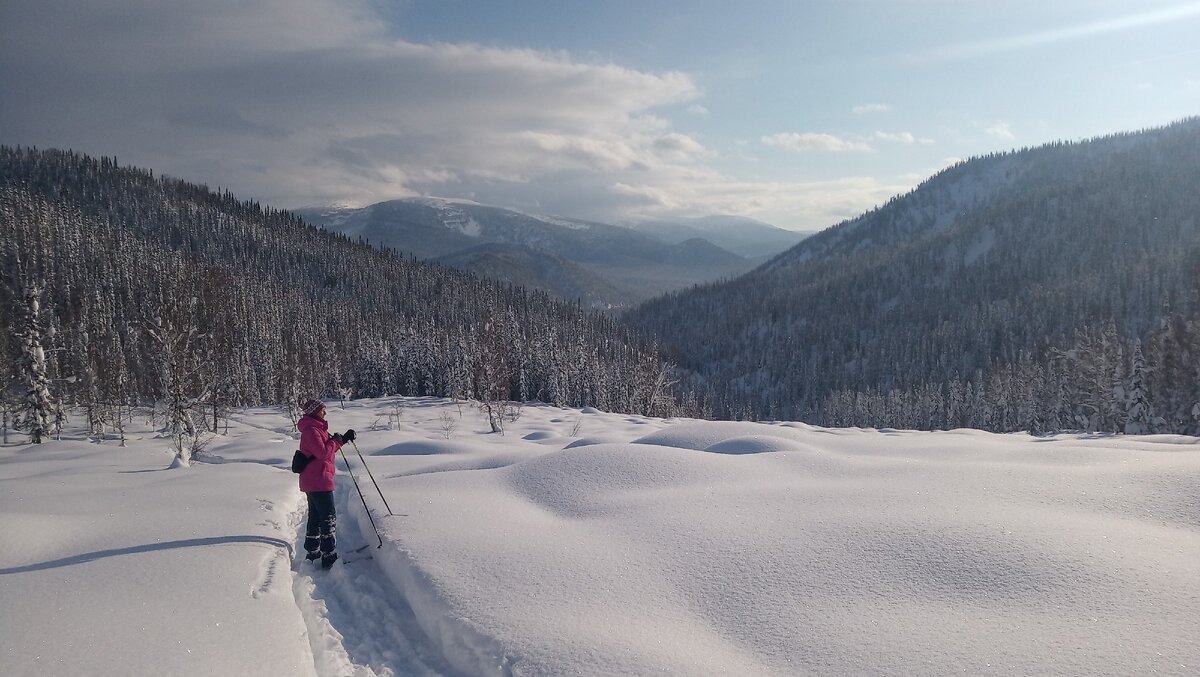 Первые четыре дня шёл снег нон-стопом! А вот 3 января распогодилось чудесно! Решила таки сделать выход от приюта Найдова, который расположен на слиянии Амзаса и Алгуя, до Куприяновской поляны туда и обратно, что составляет 22 км с набором высоты 700 м. До Рубановского стана снегоходка позволяет идти хоть на лыжах, хоть просто пешком - снег плотный, укатанный, а вот дальше тропили лыжники по глубокому снегу и по этой лыжне спустились с перевала до самого Казыра. Отдохнули в приюте, который оказался не заперт. В домике было даже тепло, хотя последняя группа туристов ночевала в нём день назад. Обратно шли по собственным следам ещё проще. Лыжи натерли мазью держания, чтобы на подъеме снизить отдачу назад. Вернулись уже в глубоких сумерках и застали на вершине перевала великолепный закат! Впервые осуществила подобный лыжный ПВД, после чего приобрела туристические лыжи, более подходящие для подобных путешествий.