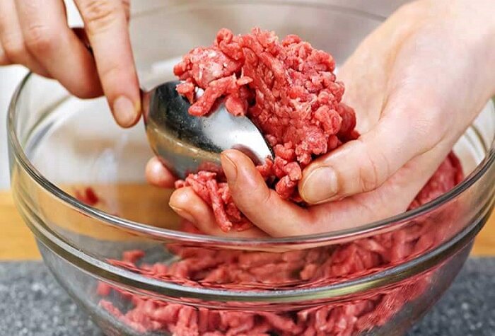 4. Фарш посолить и поперечить, разделить на 4 (6) одинаковых кусочков, в зависимости от того, для скольких людей готовится ужин (обед).