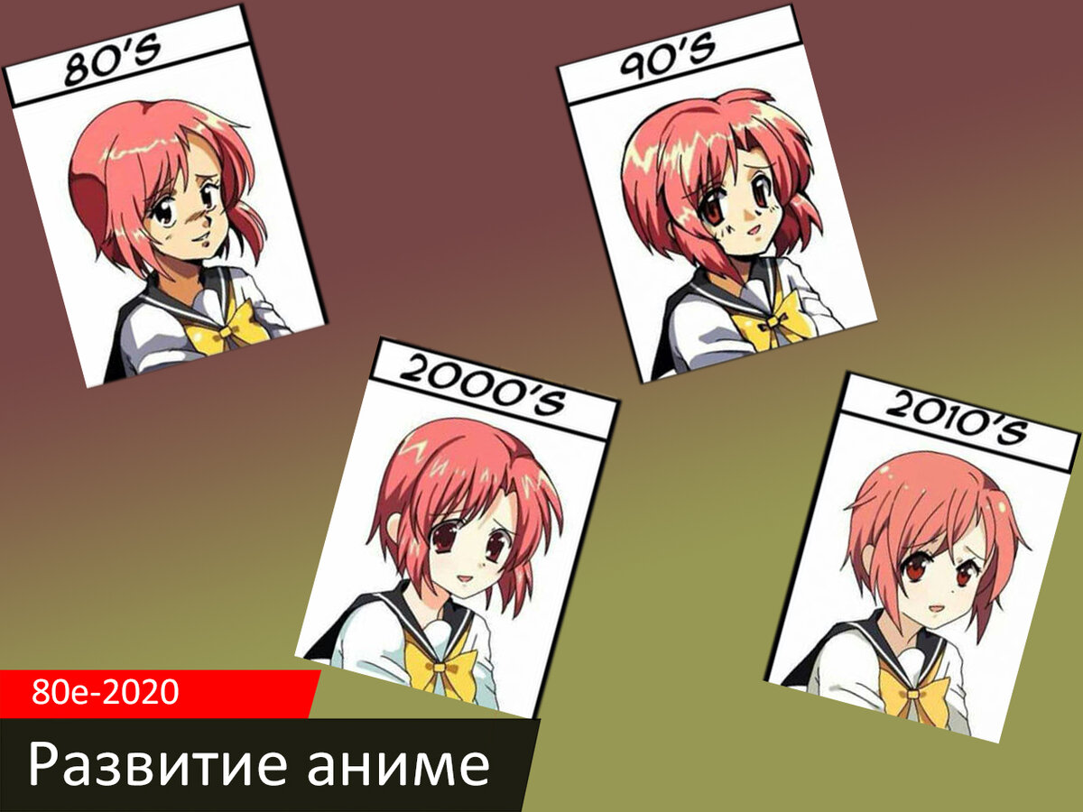 90е же привлекли своими Махо сёдзе и различными сильными и привлекательными героями типа Dragon Ball Z, Pokemon, Sailor Moon, Ranma 1/2, Slayers. + появление больших глаз как стереотипа.