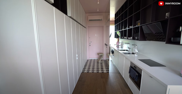 Нетривиально расположен и холодильник – он встроен в длинный шкаф во всю стену, что вполне соответствует вытянутой планировке квартиры. Распознать холодильник можно только по характерным ручкам.