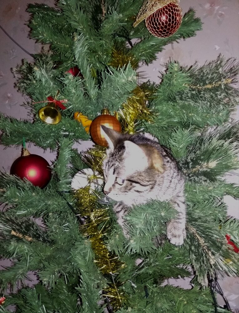 В последующие пару дней нам пришлось вытаскивать кошку из ёлки, ухватившись за все возможные части её организма. То за лапу, то за хвост. Удачей было вытянуть её за шкирку.