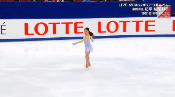 Наконец-то Рике покорился четверной сальхов, который уже давно получался у неё на тренировках. Судьи оценили сальхов на +3.19 ГОЕ - довольно щедрая оценка для строгих японских судей. Правда они почти сразу реабилитировались, поставив Рике недокрут на тройном акселе.