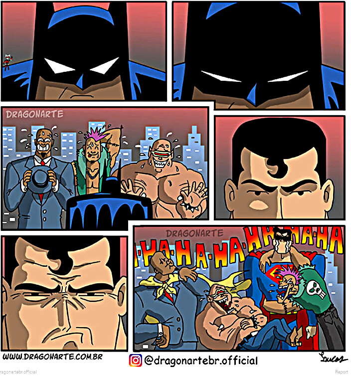 Предлагаю посмотреть комиксы о весёлом сравнении двух самых крутых и известных героев комиксов. Кто пользуется большим авторитетом у нехороших парней? И правда ли, что сила решает всё, или смекалка окажется важнее? Сегодня вас ждёт сборник, собранный из прикольных комиксов созданных бразильским художником Драгонартом. Лукас Эдуардо, больше известный в сети под ником Dragonarte создаёт юморные зарисовки из жизни супергероев, которые вы легко сможете отыскать в Instagram и Facebook. Эти мини - истории о супер-героях будут понятны без слов читателям из разных стран, а ещё они наполнены спрятанными пасхалками. Так что не забудьте посмотреть на арты чуть внимательнее, чтобы найти скрытые детали или персонажей из других известных мс и комиксов. Бэтмен и Супермен. Весёлое соперничество в комиксах уже начинается! Раунд первый - Крутой взгляд Победа за Бэтсом. Ну не может Супс устрашить злодеев одним взглядом. Да, он крут, когда в действии, но внешний вид парня в трико, злодеев не пугает до др