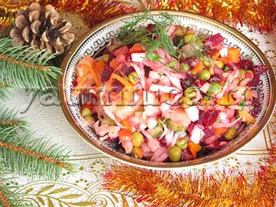 6. Охлажденный винегрет с капустой и горошком достаем из холодильника, выкладываем на блюдо и подаем к столу. Всем желаю приятного аппетита!