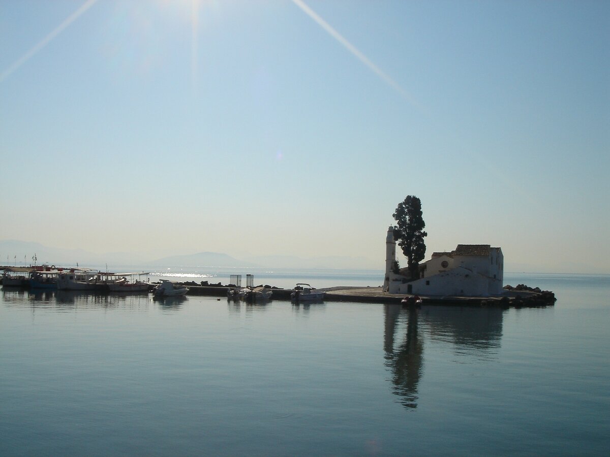 Монастырь расположен на отдельном крошечном островке, соединенный тонким перешейком с Корфу.