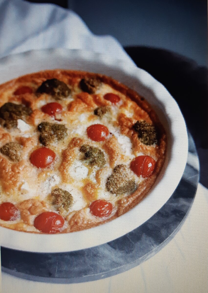 2 | Форму смазываем оливковым маслом, выливаем омлет, сверху выкладываем нашу начинку – просто кусочки – сырую брокколи, черри и брынзу.