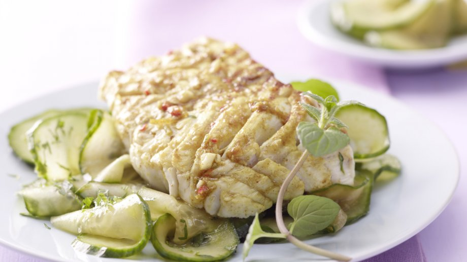 Обжарьте рыбу на сковороде-гриль на среднем огне, в течение 3минут с каждой стороны. Подавайте филе вместе с огуречным салатом, сбрызнув соком лайма, по вкусу.