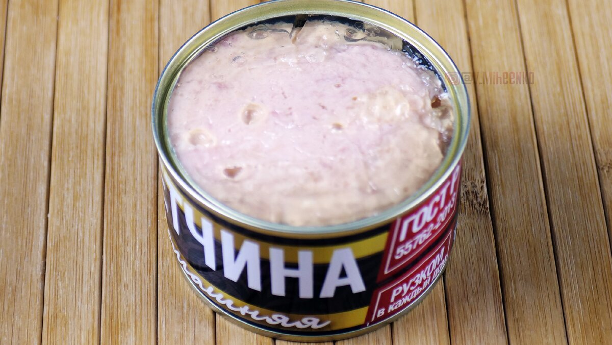 И вот моя находка, совершенно случайно прихватила баночку ветчины от РУЗКОМ стоимостью 83 рубля (акции не было, но и так не дорого)