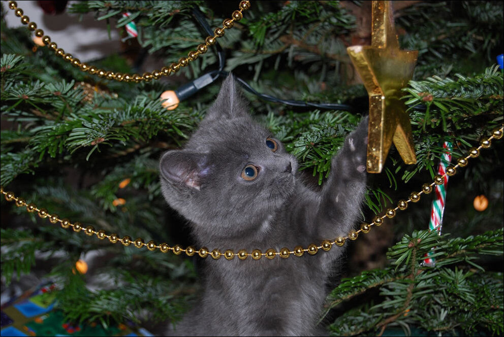 А теперь внимательно посмотрите на свою ёлочку. Возможно, пока вы смотрели нашу подборку новогодних котиков, ваш котик уже залез на ёлку и устроился там поудобнее.
