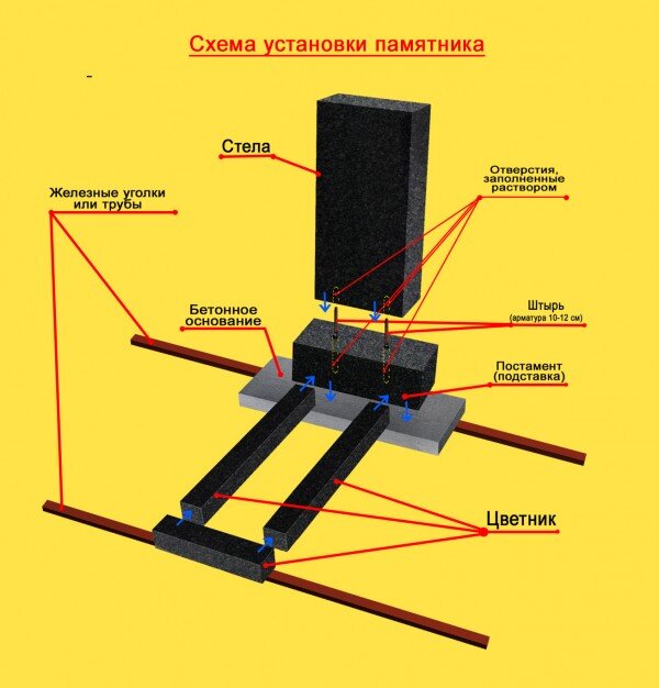 - На бетонную плиту ставится гранитный постамент (подставка), он клеится к бетонному основанию цементным раствором (цемент 500 марки, разведенный с песком в пропорции 1 : 3) или специальным клеем для камня, и уже на него при помощи цементного раствора крепится стела. Стела и постамент скрепляются между собой двумя металлическими штырями (арматура 10-12 см). Отверстия для штырей тоже заполняются раствором. Диаметр отверстий должен быть несколько больше чем размер арматуры, т.к. при разном расширении этих материалов зимой/летом в камень может «разорвать» (образуются трещины).
