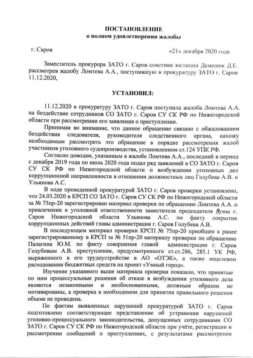 .....Всего же в различные правоохранительные органы (УВД, прокуратура, СКР) сегодня направлено более десяти заявлений по итогам деятельности бывшего главы горадминистрации Сарова Голубева и нынешнего председателя гордумы Ульянова...... (Телеграмм - канал "Арзамас-16").