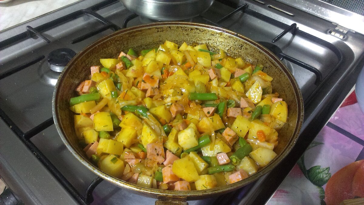 Жарим среднюю головку лука, нарезанную перьями, чтобы в процессе готовки дольше оставалась в форме, а не растворилась. Жарим до небольшой
