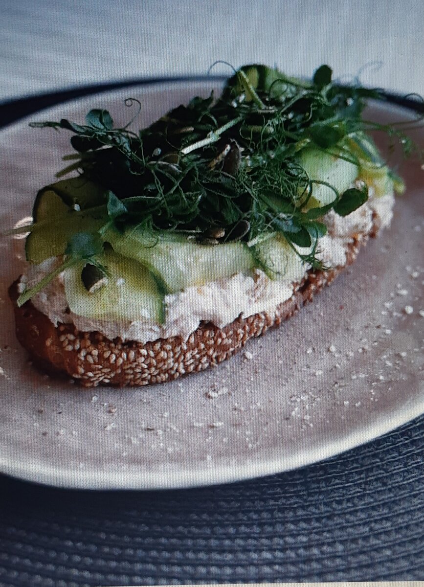 3 | Хлеб обжариваем на сливочном масле до румяной корочки с двух сторон. Выкладываем пасту с тунцом, огурец слайсами и зелень для декора.