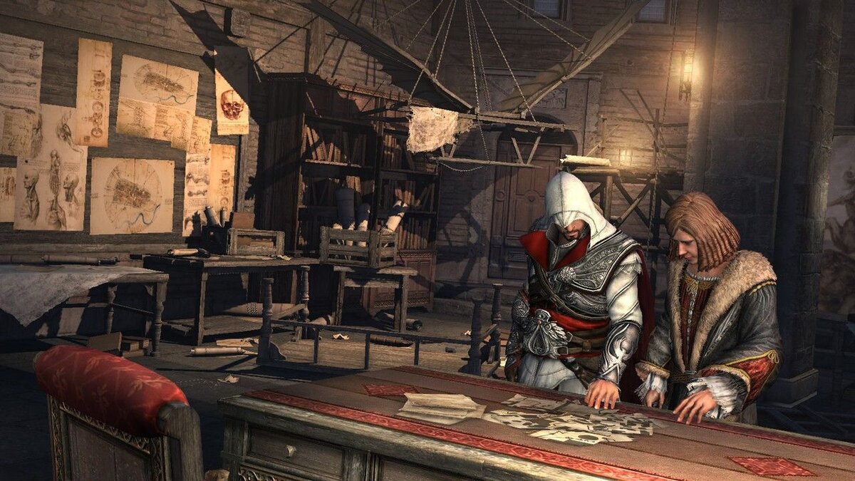 После того, как семья Эцио была казнена в 1476 году, Леонардо спрятал его в своей мастерской, а он, в свою очередь, пошел перехватить охранника, разыскивающего его.