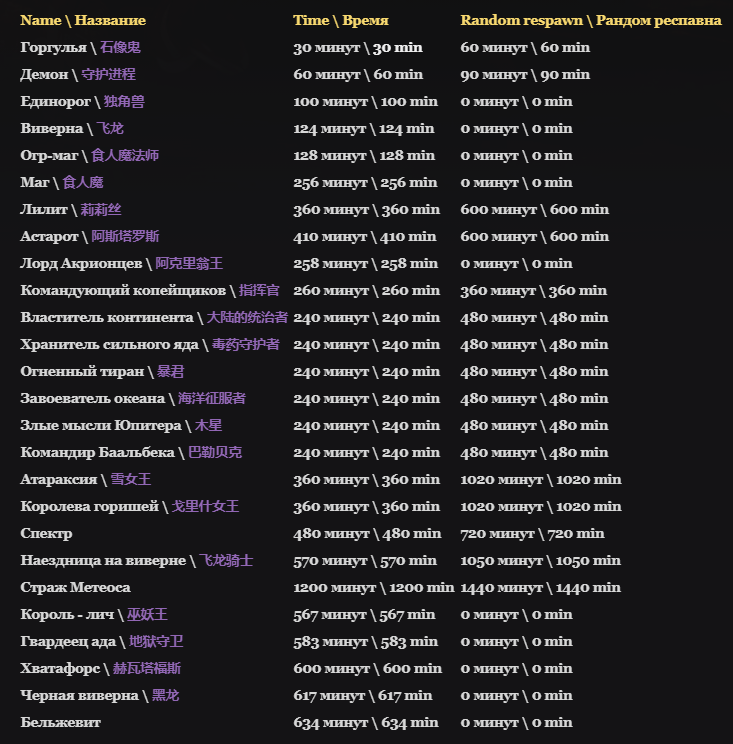 Таблица возрождения боссов острова Колфорт \ Небесного острова Эльтер \ Акра \ Храм Метеоса в R2 Online