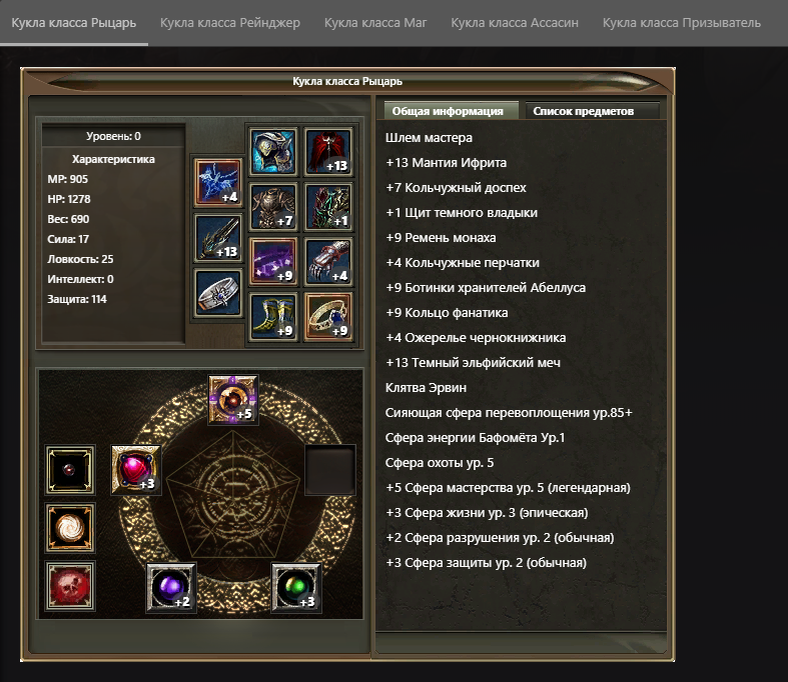 В данном меню представлены все предметы с нашего сервера, а также характеристики вашего персонажа в зависимости от вещей.
