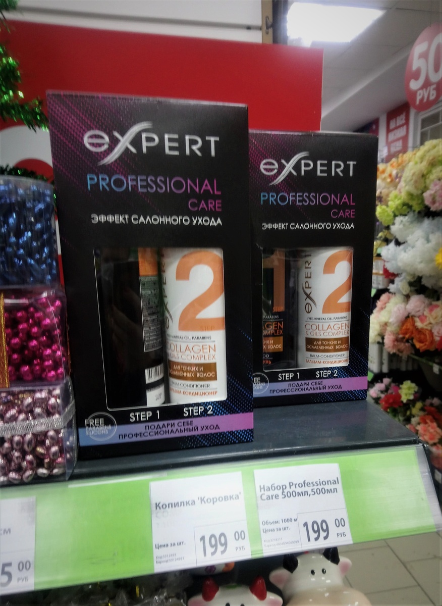Каждый раз, посещая этот отдел, нахожу в нем новинки. В этот раз, на глаза попались несколько наборов по уходу за волосами. Это шампунь и кондиционер Professional Care "Эффект салонного ухода", в 500 мл объеме каждый. Цена набора 199 рублей, производство Россия. В нашем магазине был представлен лишь в одном варианте: шампунь - Объем и блеск коллаген и бальзам - для ослабленных и поврежденных волос "Роскошь масел" коллаген. Я этот набор купила и своим мнением обязательно поделюсь в своем видео, которое выйдет в самое ближайшее время.