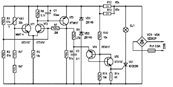 Измерительная схема собрана на транзисторах, основанных на простом дифференциальном усилителе. В качестве датчика температуры используется термистор (RK1). Термостат обязательно должен иметь гистерезис, то есть разницу между температурой включения и выключения, иначе срок службы лампы резко сократится и вероятность ее перегорания возрастет.