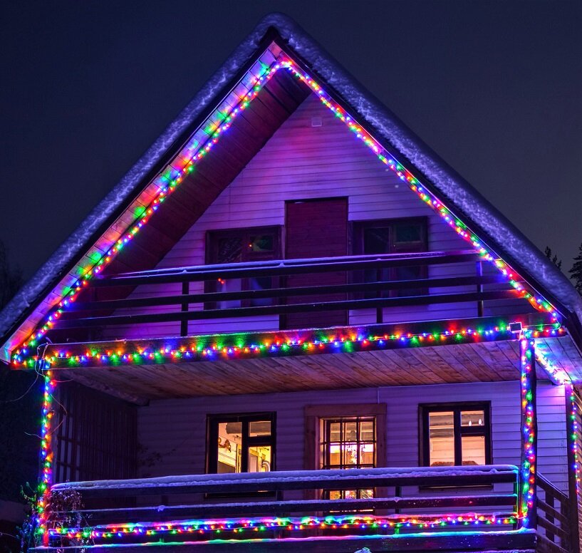 Чтобы полностью (со всех сторон) украсить одноэтажный дом площадью 100 кв. метров, а именно: разместить гирлянду по периметру стен, подчеркнуть фронтон, выделить окна и двери — потребуется 150 метров электрогирлянды. Этого будет вполне достаточно.