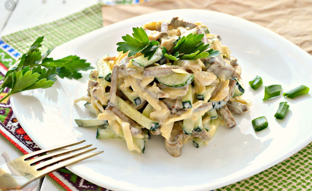 Из нежной куриной печени, маринованных огурцов и мягкого сыра можно приготовить легкий, пикантный, нарядный, простой и сытный салат, который прекрасно подойдет для любого праздничного стола.