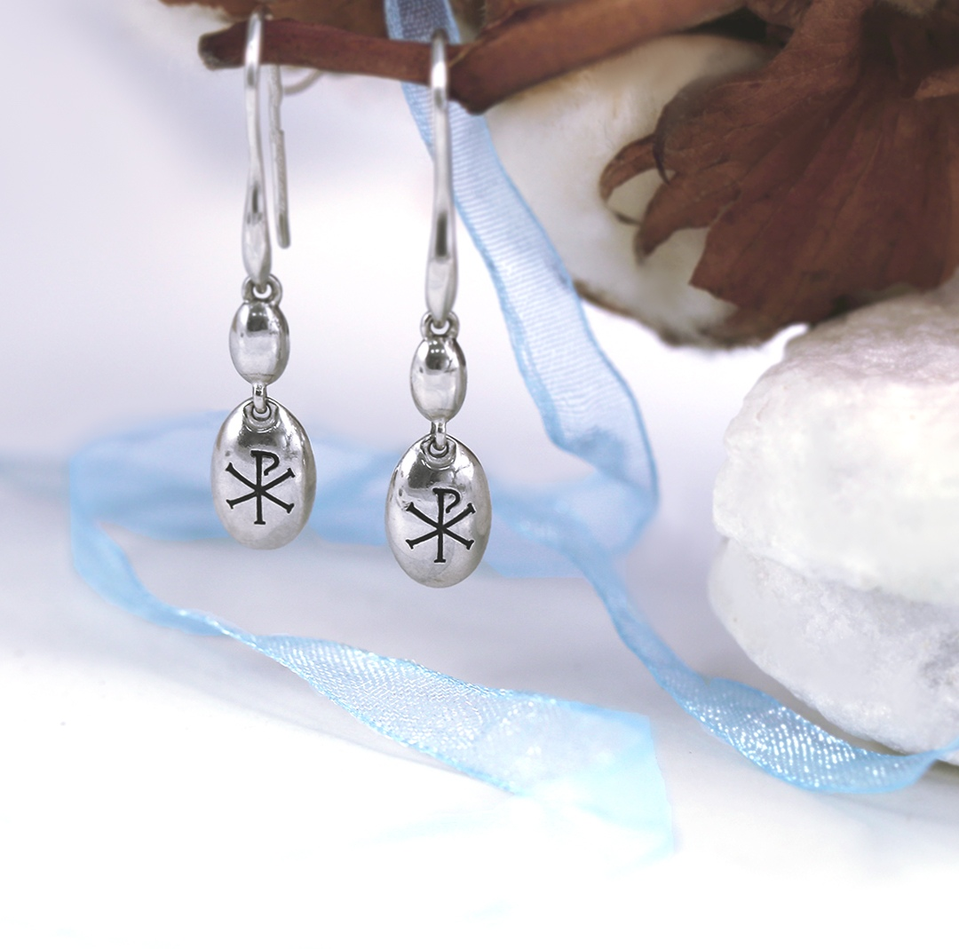 Такие серьги легко вдеваются в ухо, и можно не бояться сломать замок. При этом застежка-петля удерживает на себе изящные многоярусные сережки — например, в форме капелек. Чтобы петля не выпадала из уха и плотно прилегала к нему, к серьгам прилагаются силиконовые заглушки. А Хризма на внешней стороне украшения — это монограмма Христа: начальные буквы имени, скрещенные между собой.