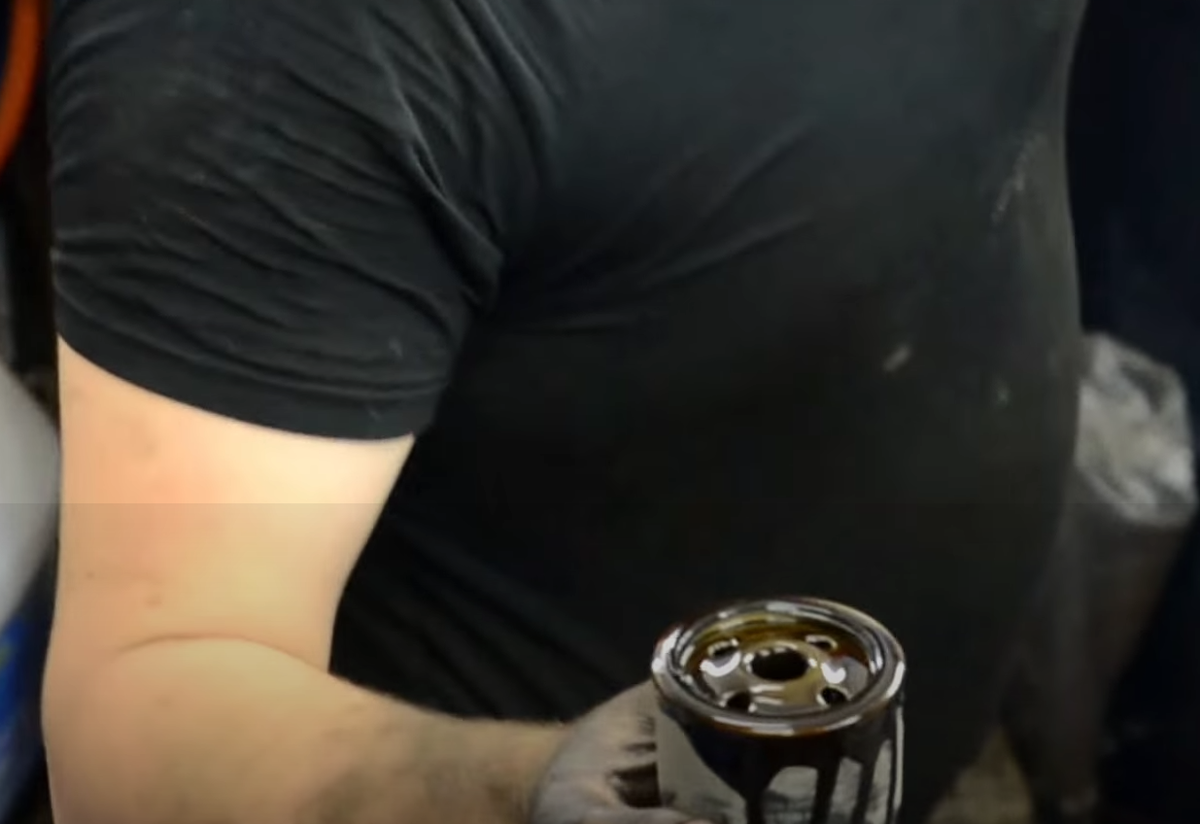 После того как большая часть слилась и масло перестало течь с сливной пробки, меняем медное уплотнительное кольцо и закручиваем сливную пробку. Так же откручиваем масляный фильтр, и заменяем его на новый.