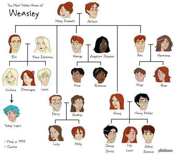 Семья Уизли была исторически чистокровной волшебной семьей. Однако, в отличие от многих других чистокровных семей, они придерживались про-маггловских взглядов. Таким образом, они не считались подходящими супругами для членов Дома Блэков, и Седрелла, мать Артура, была отлучена от семьи за то, что вышла замуж за Септимуса Уизли.