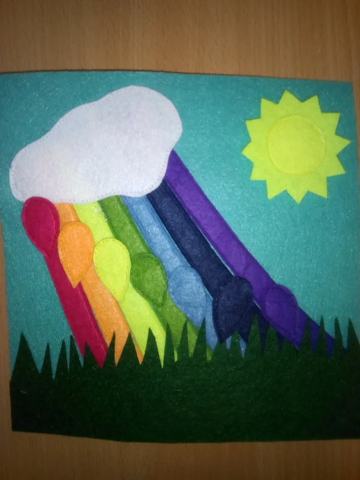 - Теперь вырезаете из фетра. Как вырезать? На фетре плотненько раскладываете нужные элементы, склеиваете скотчем и вырезаете маникюрными ножницами. Скотч легко без проблем отклеивается от фетра. Полосочек радуги и капелек должно быть семь цветов, для солнышка вырезаете основу с лучиками и круг, и для капельки вырезаете основу, чуть больше и саму капельку.