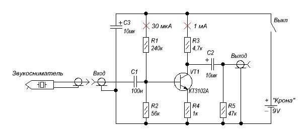 Поэтому оптимальным будет вывести сигнал непосредственно от звукоснимателя (обязательно экранированным проводом!) на внешнюю "коробчонку", согласующую сопротивление и уровень сигнала с современной техникой. Для большей автономности и радикального снижения фона питать будем от батареек. Поскольку выходной сигнал должен быть размахом не менее 2 вольт пик-пик, то напряжение питания должно быть не менее 3 вольт. Но это исключает простую схемотехнику, поскольку, например, один транзистор, включенный с общим эмиттером и эмиттерной стабилизацией тока покоя, от трёх вольт выдаст не более 1 вольта пик-пик. Поэтому возьмём "Крону". Батареи и аккумуляторы в таком форм-факторе ещё недавно использовались во многих транзисторных приёмниках, а сейчас любимы гитаристами - в гитарных примочках. Их напряжение от 7,2 до 12 вольт, обычно 9 вольт, чего нам как раз достаточно.