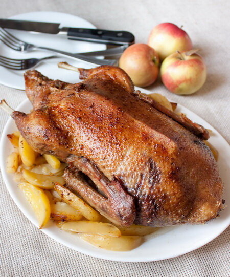 Птица по этому рецепту получилась очень сочной и аппетитной. А картофель с яблоками на гарнир - это вообще праздник :) Если вы хотите придать утке красивый красно-коричневый цвет, за 20 минут до готовности начинайте смазывать ее смесью жидкого меда и соевого соуса в равных пропорциях.