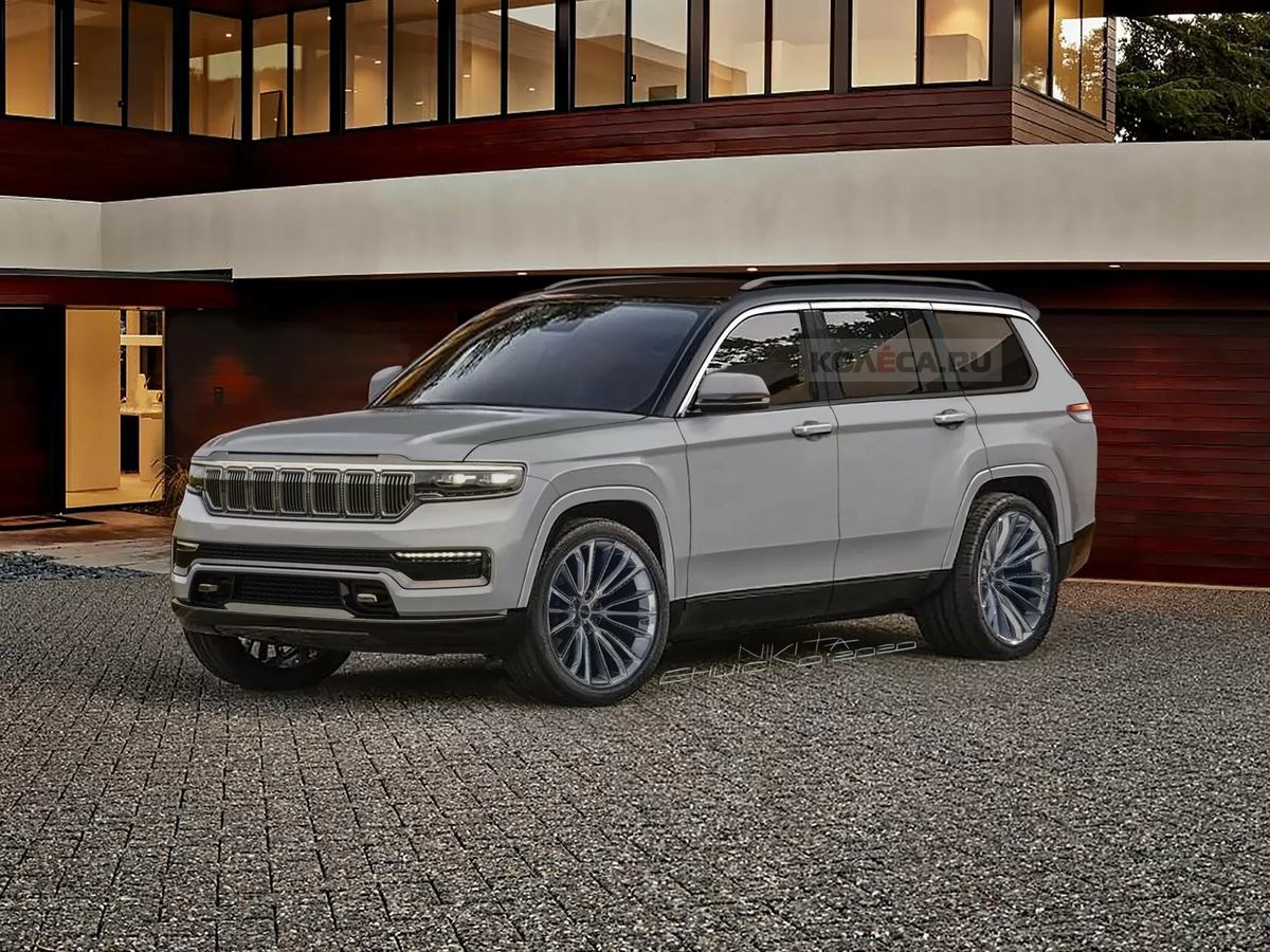 Одна из главных особенностей нового Grand Cherokee – совершенно другие пропорции. Внедорожник выглядит заметно более крупным, в том числе за счёт увеличенного заднего свеса, который необходим для размещения третьего ряда сидений. Можно разглядеть узкую подштамповку вдоль дверных ручек, протянувшуюся от фар до фонарей. Крыша наверняка получит опцию исполнения в чёрном цвете, именно такой вариант изображён на наших рендерах. Над боковыми окнами пройдёт хромированный молдинг, который будет обрамлять снизу заднее стекло – такое же решение применено на компактном кроссовере Jeep Compass. Внедорожник получит более узкие горизонтальные фонари, которые могут быть объединены светодиодной полосой, как на нашем рендере.