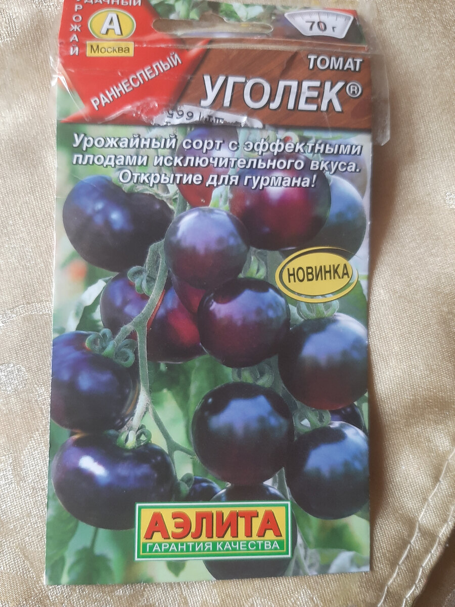 Томат Уголёк порадовал способностью развиваться в достаточно холодных условиях. Из новых сортов, которые я купила, Уголёк не был фаворитом, но надо признать, что именно он в прошедшем сезоне удивил. Когда другие кусты томатов уже не развивались, томаты Уголька зрели. Холодало, но он не сдавался и рос. Томат мясистый, некрупный, мелкий, тонкокожий, сладкий, сочный, со вкусом томата, без ощущения крупинок. Хорош для салата или просто так. Так выглядела пачка семян. Посадили томат в скудную почву, преимущественно глинистую. Урожайность у томата была средняя, то есть не как на упаковке. Растение в открытом грунте достигло 70 см, а в теплице было около 100 см. По моему опыту лучше он рос в открытом грунте, но в теплице дольше плодоносил. Этот томат был посажен в марте, пережил нашествие трипсов в апреле-мае и такое заболевание, как кладоспориоз благодаря профилактическому опрыскиванию. Коротко о том, в каких условиях вырос томат. Условия были не благоприятные. Трипсы. В апреле с поку