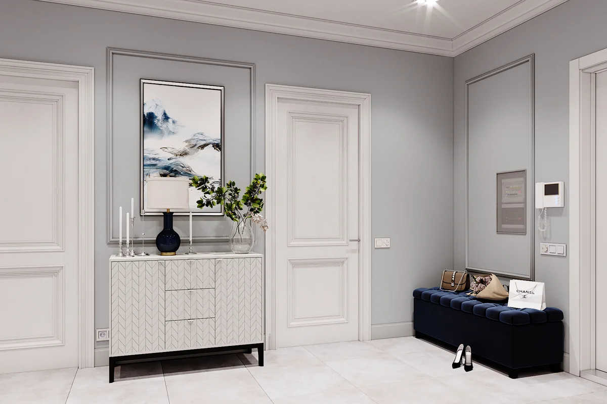 Планировки случаются самые разные, и изменить их не всегда есть возможность. Представьте, что серая дверь на фото — и есть вход в квартиру, а слева от нее прячется еще и дверь в санузел. В таких случаях входная зона оказывается настолько узкой, что даже вешалку для одежды там ставить некуда. Ничего страшного не произойдет, если вешалку с тумбой вы вынесете в более просторную часть коридора. Да, возникнут вопросы по грязной зоне, но это уже вопрос компромиссов: а они в маленьких квартирах, к сожалению, неизбежны. Конечно, с дизайнером количество таких неудобств сводится к минимуму.